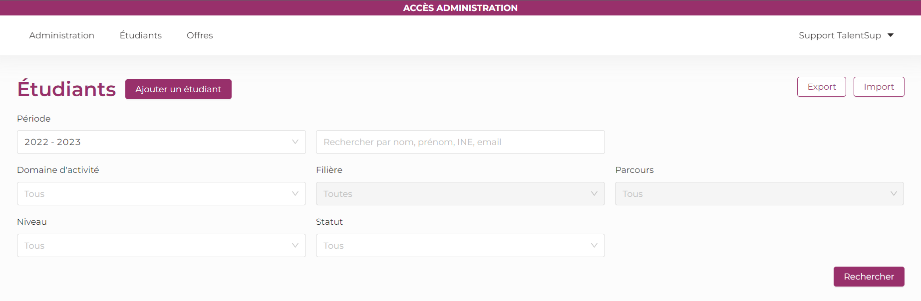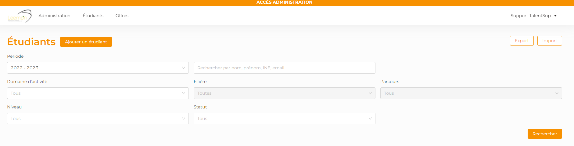 L’onglet Etudiants permet d’importer vos apprentis en recherche de contrat dans la plateforme Leemon individuellement ou par import de fichier.